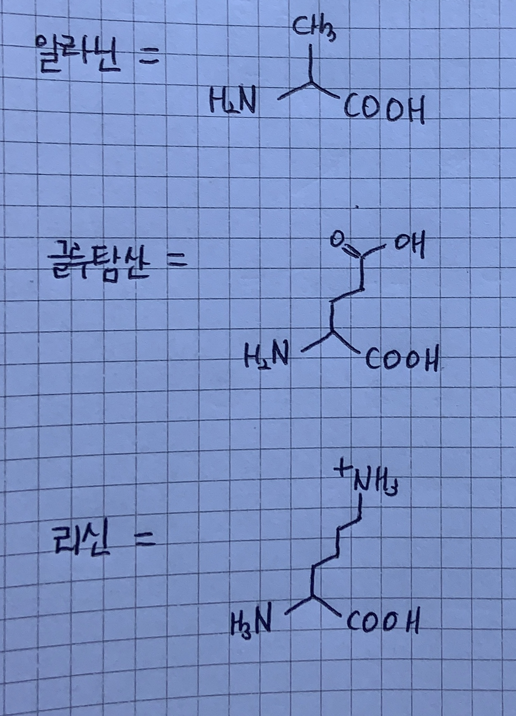 알라닌은 등전점이니 COO- NH3+를 가진 형태가 가장 많을것이고 글루탐산은 COOH가 2개 있으니 이 두개의 카르복실기의 pKa값을 고려해야 둘다 H를 내놓는지 하나만 H를 내놓는지 판단가능합니다. 리신은 염기성으로 작용할테니 아미노기 2곳에 H가 다 붙을지 한 곳에만 붙은 게 주된 이온의 형태일지는 실제로 각각의 작용기의 Ka값을 가지고 계산해야되는거라 일반화학에 더 가깝고 Ka를 알려줘야 비율이 몇대몇인지도 헨더슨하셀바흐식으로 계산이 가능할 것으로 보이네요. 예를 들어 그림. -