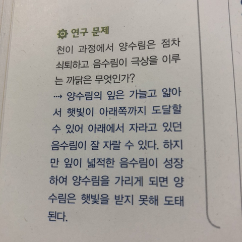 그런데 사진의 설명과 같이 양수림의 잎이 가늘고 얇다는 것이 옳은 설명인가요? 보통 양지식물 잎의 특징은 잎이 두껍고 좁은것 아닌가요? (반대로 음지식물의 잎은 얇고 넓다고 배웠구요)