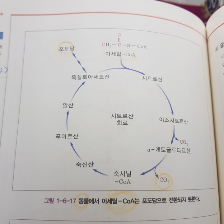 답댓글 작성자미소 작성시간 20.01.14 으딕이 아세틸-CoA는 옥살로아세트산을 생성하는 것이 아니라, 2개의 이산화탄소 분자로 완전 산화됩니다.