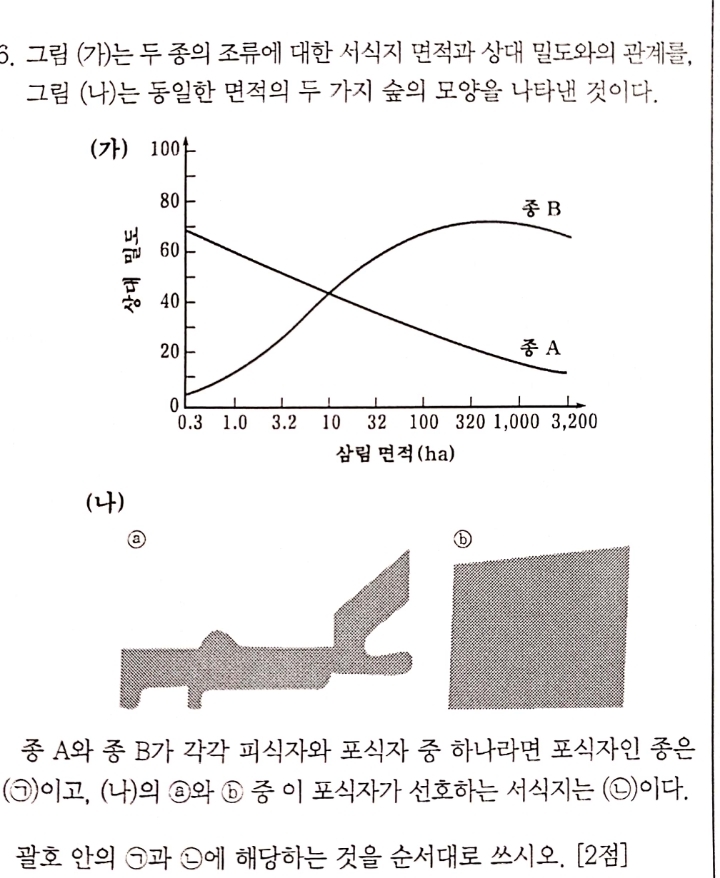 작성자십이공 작성시간 20.09.04 문제가 좀 이상하네요. 생태학 각론서를 읽어봐도 첫 번째 그래프에서는 종 A와 B가 각각 가장자리종과 내부종인 것만을 알 수 있지 어느 종이 포식자이고 피식자인지는 주어진 정보만으로는 판단하기 어렵습니다. 가장자리를 선호하거나 내부를 선호하는 것은 종의 특성이지 포식자와 피식자의 특성이 아닙니다. 오히려 종종 일부 가장자리는 포식자의 연결다리로 쓰여 포식률이 높은데 그럼 피식자는 자연히 내부를 선호하게 되겠죠. 가장자리 효과와 포식피식은 추가적인 정보가 없는 이상 연관지어 생각하지 않으시는게 좋을 것 같습니다.