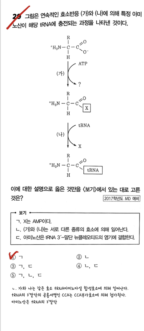 문제 답은 1번입니다. ㄱㅊㅇ 총론에서 아미노산은 tRNA의 3’말단 A의 -OH와 결합한다고 돼있는데,