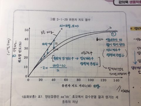 답댓글 작성자아메리카노 작성시간 21.03.29 아쟈아쟈⠀̆̈ 유전자 지도를 그릴때 ABC순서대로 있다고 하고, A와 B사이의 거리를 x라고 하고, B와 C사이의 거리를 y라고 하고, A와 C사이의 거리를 w라고 합니다. 이것을 식으로 하면 이중교차율(z)은 x+y-w/2가 됩니다.