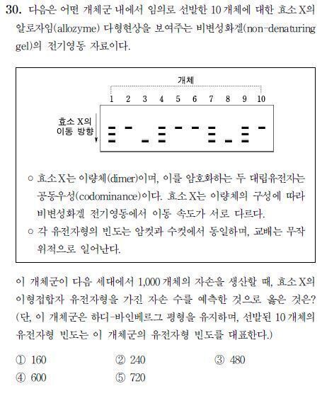 2010년 MD 30번 문제의 경우, 자손 세대의 개체 비율을 구할 때 10 개체의 대립유전자 빈도와 별개로 새로 대립유전자 비를 따져서 풀어야 답이 나옵니다.