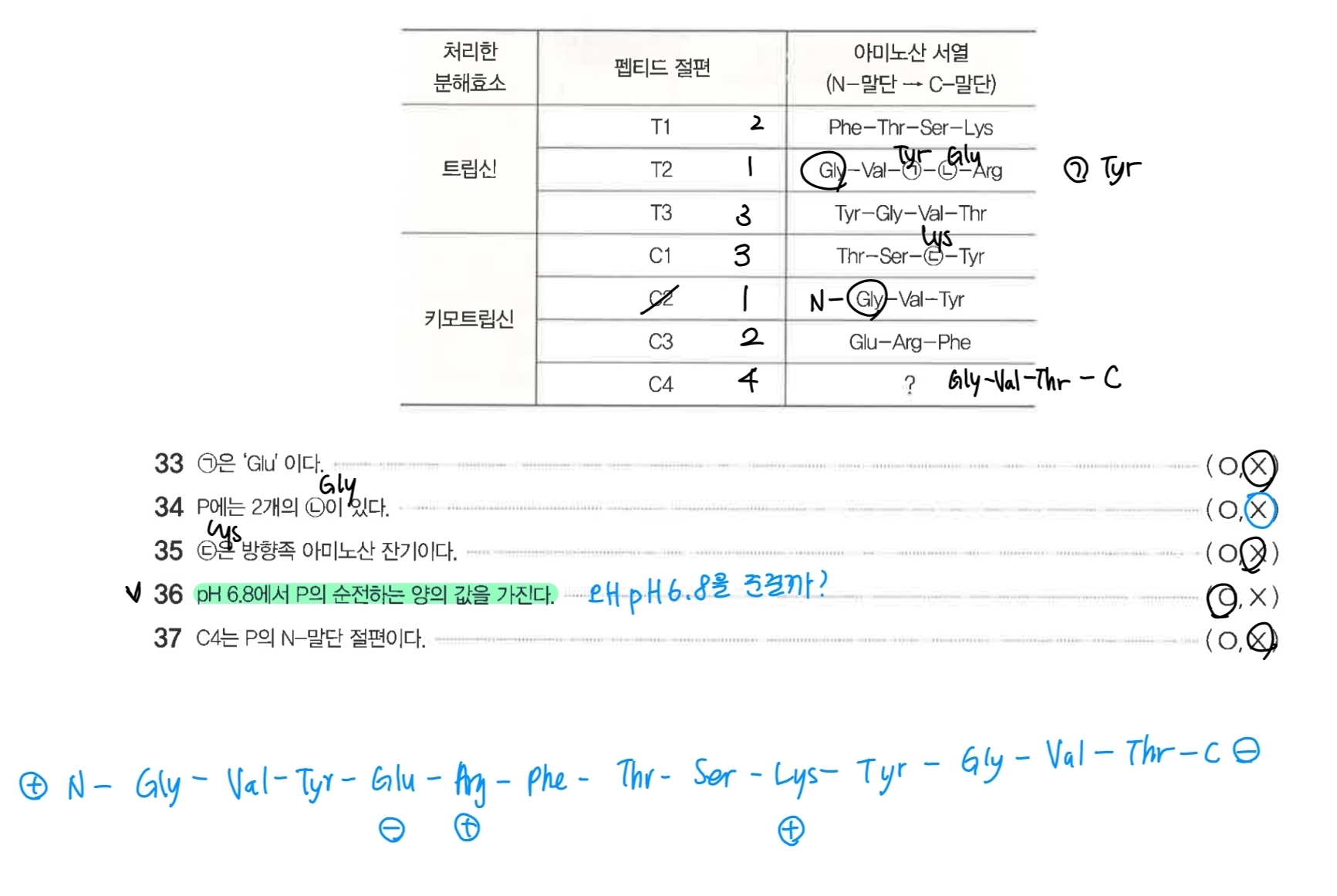 이부분 해설 강의를 보니 문제에서 주어진 pH6.8을 고려하지 않고 글루탐산, 아르기닌, 리신 같이 전하가 있는 아미노산의 개수와 전하의 종류를 찾아 양전하가 더 많으니 양전하 단백질로 보더라구요!!