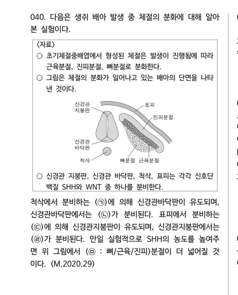 위 문제는 MD 2021. 29번에서 따온 것입니다. 이 문제는 '체절' 분화에 대한 실험에 대한 내용입니다. '체절'분화와 관련해서는 표피와 신경관지붕판에서 분비되는 Wnt, 척삭과 신경관바닥판에서 분비되는 Shh가 체절을 다양한 조직으로 분화시킵니다.