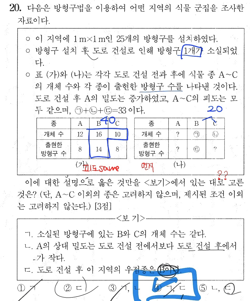 작성자아재 작성시간 23.10.24 일단 도로 건설 후 A의 밀도가 증가했다는 것을 통해 없어진 A의 개체수는 일정하고 따라서 소실된 방형구에는 A가 없음을 알 수 있습니다.
