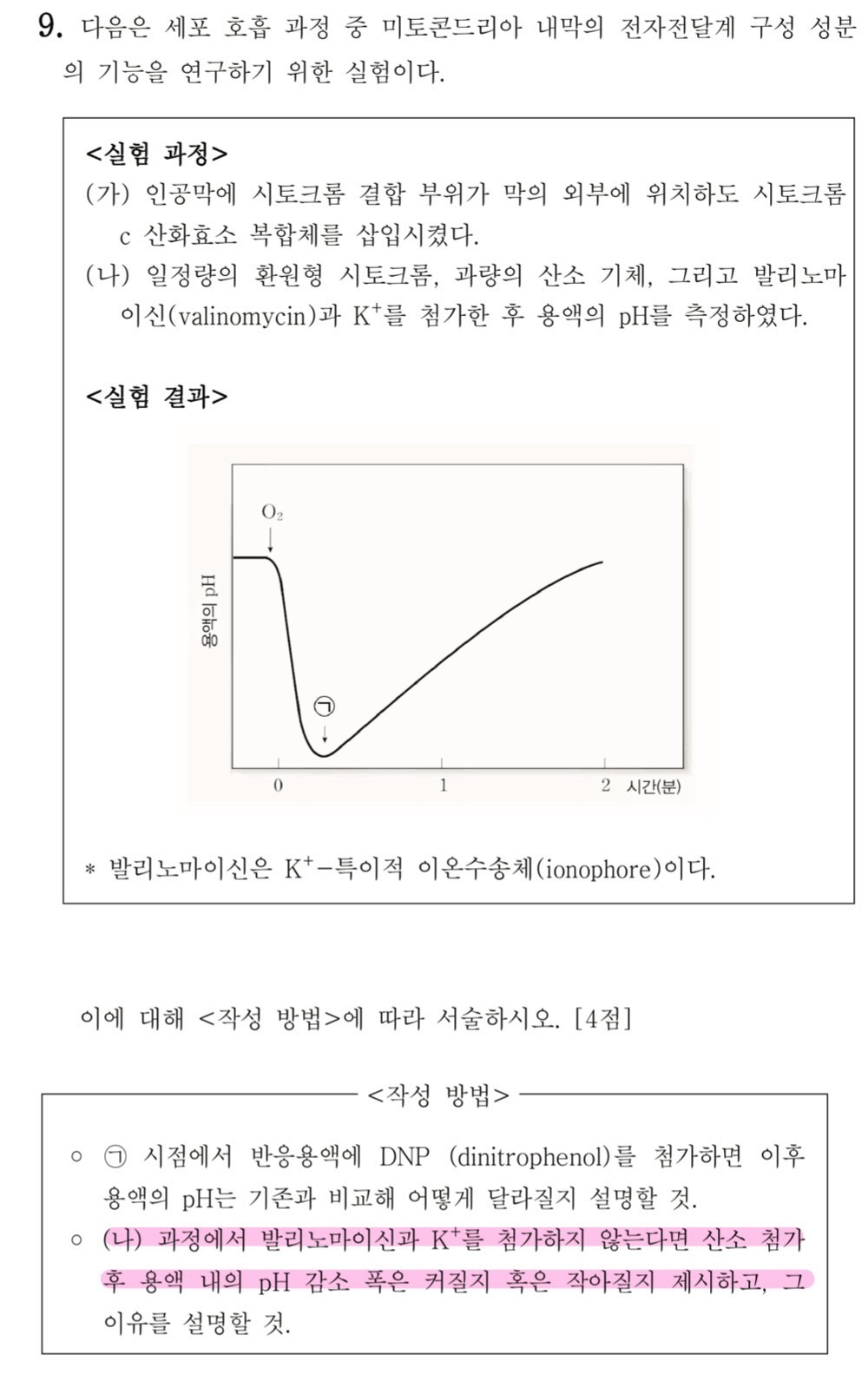 1. 그런 관점에서 발리노마이신이 무조건 ATP합성을 저해한다고 보지 않고, 단지 K+를 농도구배에 따라 운반하는 역할을 한다고 보고 문제를 풀면.. K+와 발리노마이신을 처리했을 때 K+가 막 안으로 이동할 것이고, 그로 인해 전기적 기울기가 생기면 H+는 막 밖으로 나가려고 할 것이므로 막 밖의 pH가 감소하게 되는거 아닐까요... 그 이후에 DNP를 처리하면 막 밖의 H+가 막 안으로 다시 들어갈 것이고.. 그러면 막 밖의 pH는 다시 증가하겠죠.. -