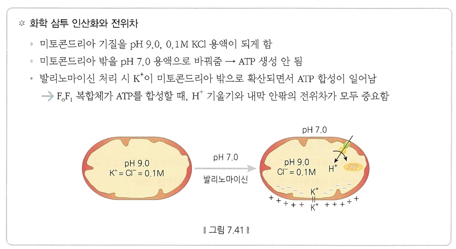 실험조건이 아닌 일반적 상황의 미토콘드리아에서는 막사이 공간의 K+가 발리노마이신에 의해 기질로 들어오면서 전기화학적 기울기가 감소하기 때문에 ATP합성이 저해됩니다..