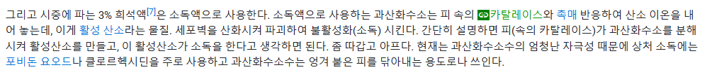 그런데 과산화수소 소독의 원리는 과산화수소 분해로 나온 활성산소가 세포를 파괴하는 것을 이용하여 세균의 세포를 파괴 한다고 합니다. 그래서 너무 큰 상처에는 오히려 사람의 세포를 파괴할 수 있다고 합니다.