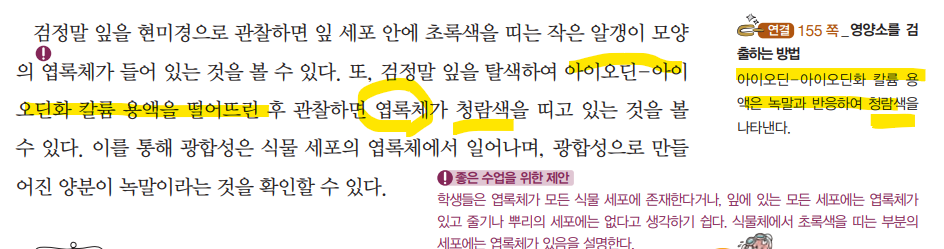 광합성 단원에서 아이오딘-아이오딘화 칼륨 용액과 반응해서 청람색을 띠는 것이