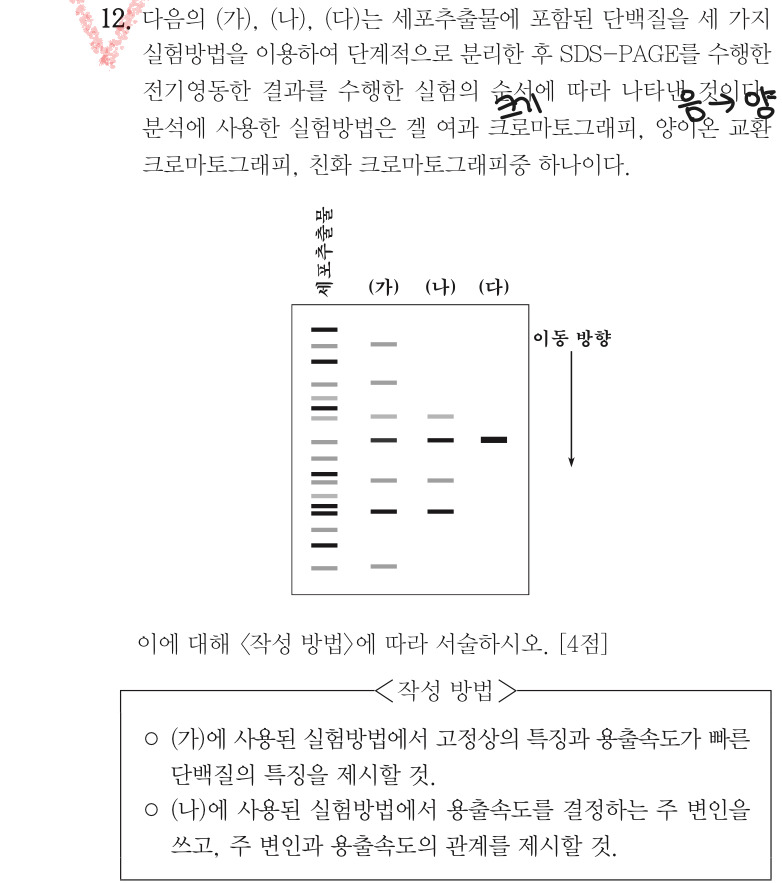 작성자정틱 작성시간 25.07.22 친화 크로마토그래피 -> 목표로 하는 단백질의 친화 표지를 이용해 단백질 분리 => 친화 표지에 친화력이 높은 단백질만 용출되므로, 밴드 하나만 나타난 (다)가 친화크로마토그래피