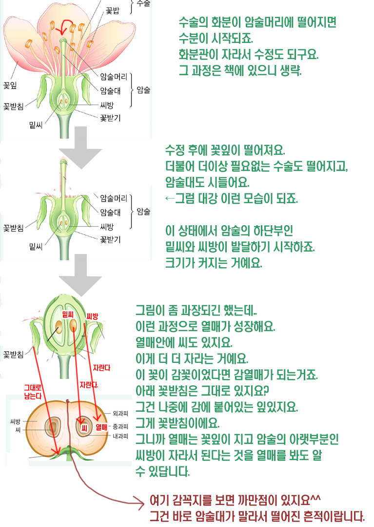 수정이 된 후에 밑씨는 씨가 되고, 씨방은 자라서 열매가 되면서 꽃잎은 떨어지게 되요. 열매(씨방부분)는 계속 커지겠지요.