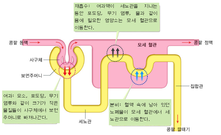 세뇨관을 지나는 동안 원뇨 속의 포도당, 아미노산 등은 모세혈관으로 재흡수되며, 모세혈관 속에 남아 있는 요소 등은 세뇨관으로 분비된다. 라고 설명되어 있습니다.