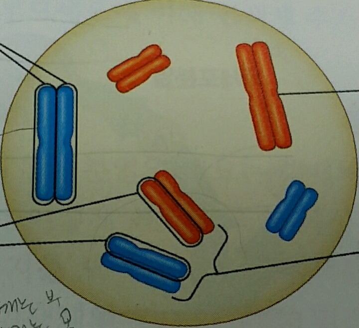 그림은 상동염색체쌍이 보이니 이배체이고 이 세포의 반수체는 상동쌍이 분리되어 염색분체끼리 잇는 n 핵상이 되겟죠 -