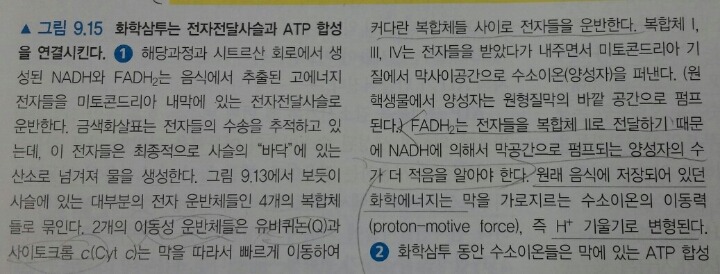 "FADH2는 전자들을 복합체2로 전달하기 때문에 NADH에 의해서 막공간으로 펌프되는 양성자의 수가 더 적음을 알아야한다."