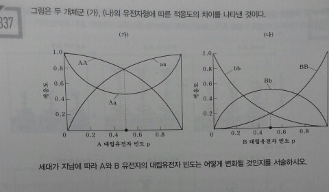 작년 ㄱㅊㅇ문풀 337번문제 작성자치열하게|작성시간15.09.10|조회수530 목록 댓글 1 글자크기 작게가 글자크기 크게가 이문제 풀이를 봐도 잘모르겠어서 설명좀 부탁드려요 다음검색 현재 게시글 추가 기능 열기 북마크 공유하기 신고 센터로 신고 댓글 댓글 1 댓글쓰기 답글쓰기 댓글 리스트 작성자생물쌔앰 | 작성시간 15.09.11 (가)는 적응도가 AA와 aa가 Aa보다 높으므로 1:1의 비율에서 한쪽으로 치우치게될것이고(나)는 Bb가 더 적응도가 높으므로 B와 b의 빈도는 1:1에 가까워질것같네요 댓글 전체보기