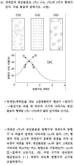 2005 16번 생태학 작성자합격을향해돌진|작성시간15.10.31|조회수668 목록 댓글 1 글자크기 작게가 글자크기 크게가 2번째 문제에서 답이 1인 이유 알려주세요ㅠㅠㅠ 다음검색 현재 게시글 추가 기능 열기 북마크 공유하기 신고 센터로 신고 댓글 댓글 1 댓글쓰기 답글쓰기 댓글 리스트 작성자phototropin | 작성시간 15.10.31 저는 2번째 답 2번으로알고있습니다.성숙림의 소나무는 규칙분포니까 방형구 수 비율 높아질것이고, 마지막 괄호 안에 평균밀도가 1~2 개체가 되도록 한다는 조건이 있으므로 2번이 답이라고 알고있습니다.혹 틀렸다면 말씀해주세요~^^; 댓글 전체보기