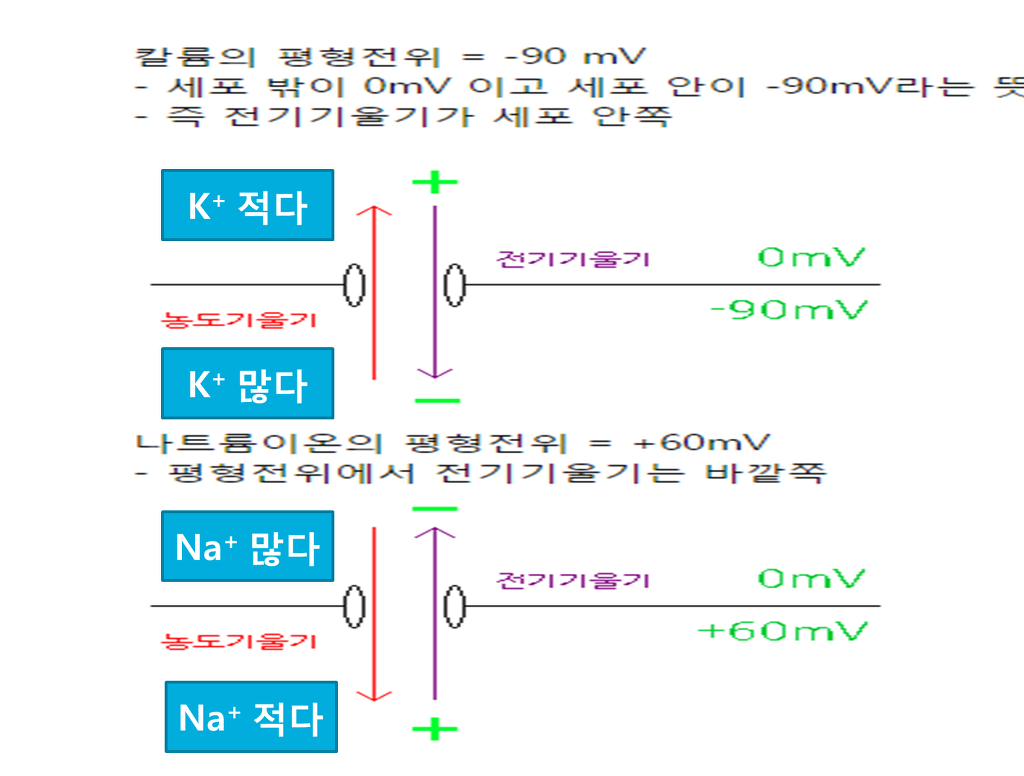칼륨 평형 전위 -90mv 나트륨 평형 전위 +60mv