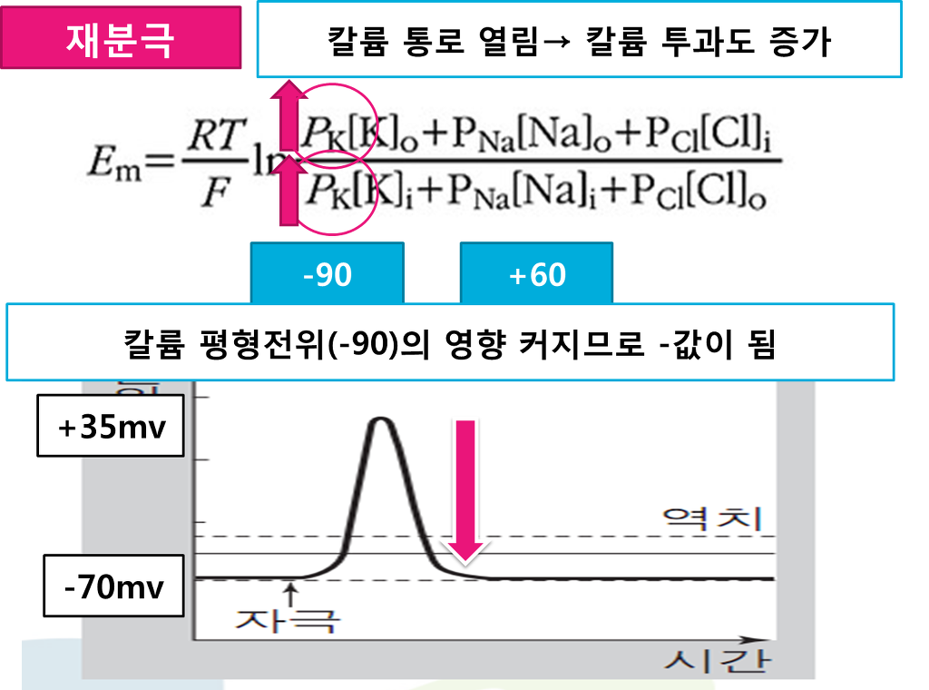 재분극일때 칼륨 통로가 많이 열려 PK+값이 커져 칼륨 평형 전위 –90mv의 영향을 많이 받아 -로 내려간다.