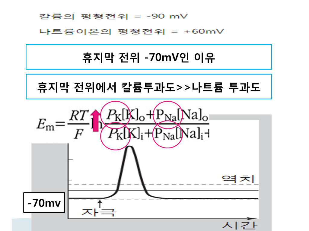 휴지막 전위일때 칼륨 통로 투과도가 더 크기 때문에 휴지막 전위는 -를 띈다. -70mv