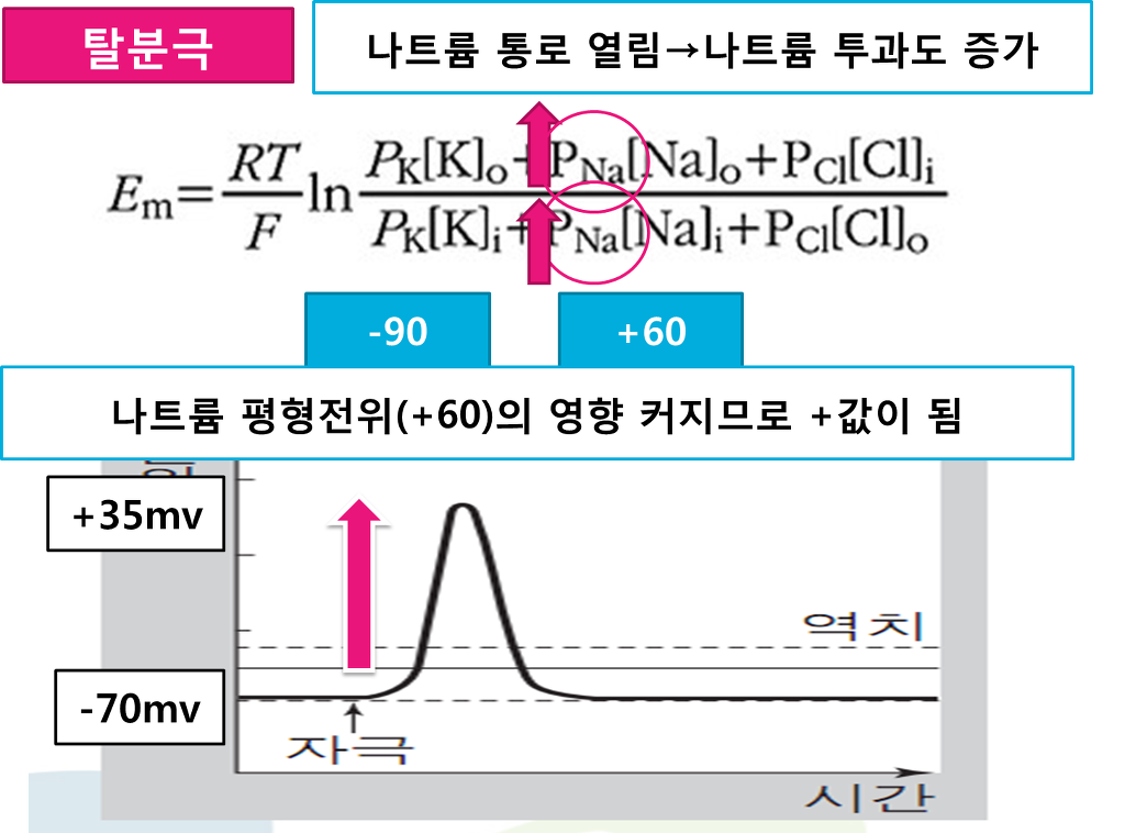 탈분극일때 나트륨 통로가 많이 열러 PNa+값이 커져서 나트륨 평형 전위 +60mv의 영향을 많이 받아 +로 올라간다.