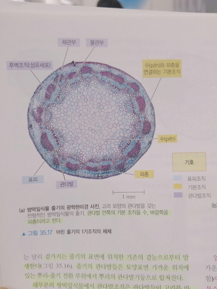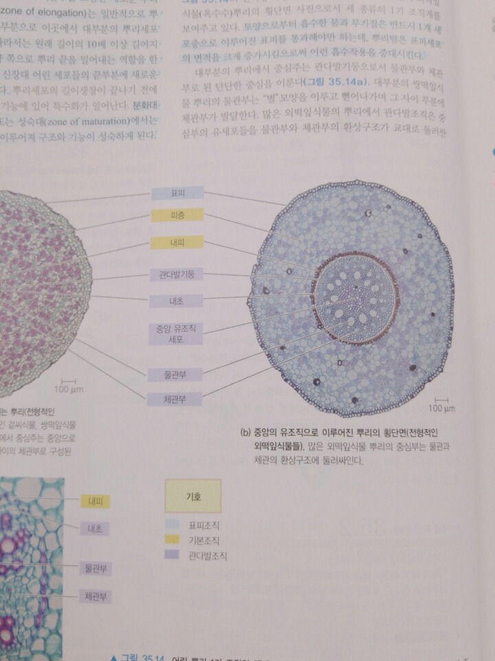 일단 첫번째 사진에서 단자엽식물 뿌리의 중앙부위는 총론에서 수라고 나와있고 이게 유세포 부위라고 합니다. 그리고 캠벨의 앞쪽 설명에 의하면 기본조직계에서 관다발조직 안쪽의 기본조직을 수라고 한다고합니다 그렇다면 아래사진에서 왜 유세포 부위가 기본조직이 아니라 관다발조직으로 분류된건가요?