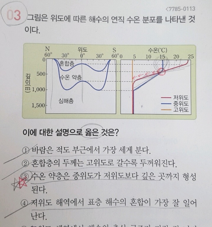 중위도에서 수온 약층의 깊이가 깊은데요.