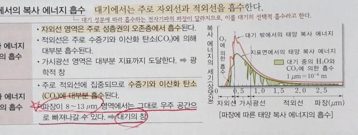 작성자지과교칼 작성시간 17.08.15 가시광선영역에서 그래프의 빨간선과 검은선의 차이는 흡수가아닌 지구상층대기에 부딪혀 반사되어 우주공간으로 나가는 양을 말합니다. 알베도(albedo)라고도 하지요. 흡수를 보시려면 검은선 아래의 연두색 영역을 보셔야하는데 가시광선 영역에서는 연두색으로 나타난 부분이 거의 없지요? 따라서 가시광선은 대기에 거의 흡수되지 않는다 보시면 됩니다.