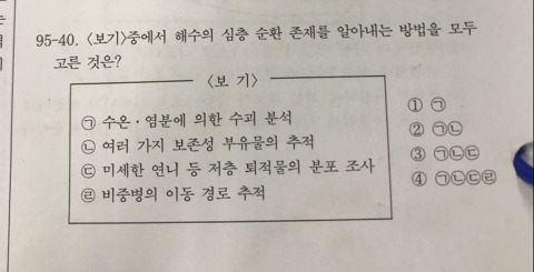 보기 ㄹ은 비중병을 추적부표로 사용해서 이동경로를 추적한다고 되어 있으므로 틀린 보기라는 것을 알 수 있습니다.