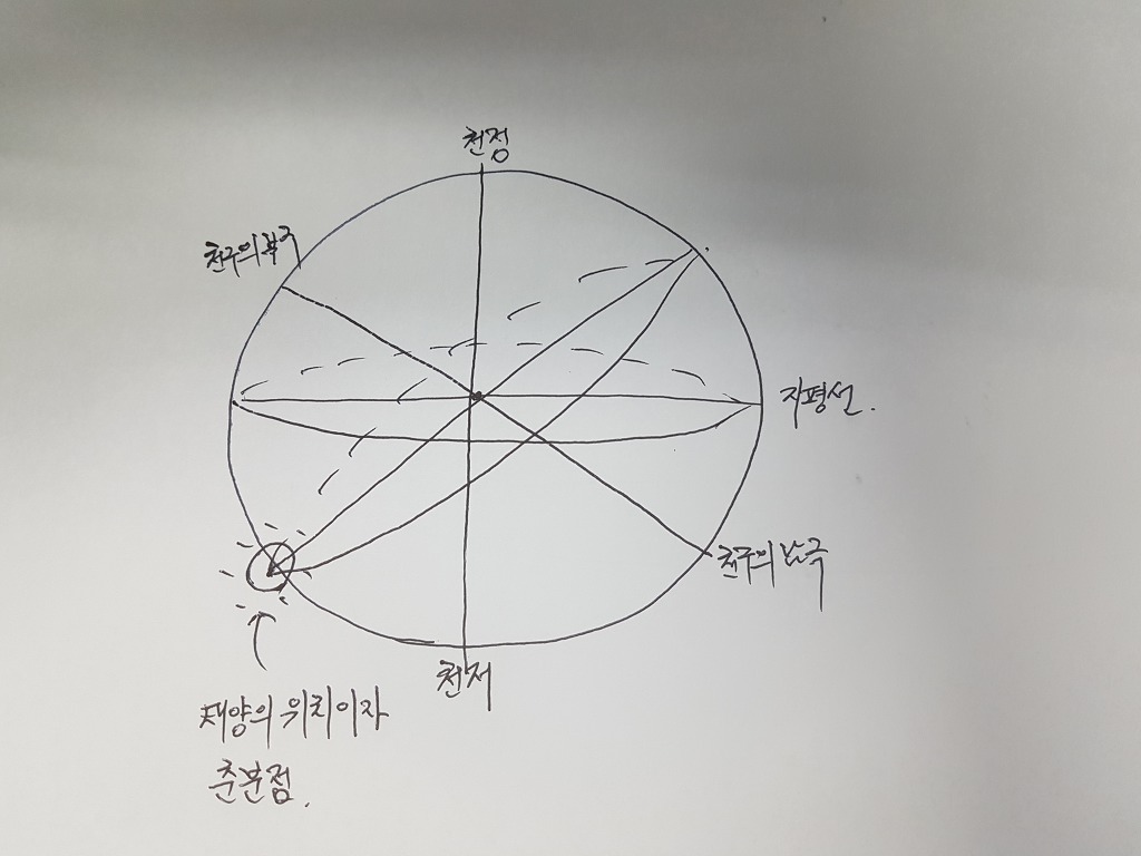 • 작성자맨틀대류설 | 작성시간 19.01.05 시간은 태양의 위치에 따라 나타낼 수 있습니다. 적위가 0인 춘분이나 추분은 천구의 적도와 일주권이 같다고 보고, 오전 6시에는 동점 정오(12시)에는 남중(남점을 지나는 수직권 위에 위치), 18시에는 서점, 자정에는 북점을 지나는 수직권에 위치한다고 볼 수 있어요. 자정에 태양의 위치를 그리고, 이날 춘분날이라고 했으니까 태양이 지나가는 시간권을 0h선을 그릴 수 있어요~ 만약 추분날 0시를 그리라고 하면 저 그림 그대로 놓고 태양의 적경만 12시로 바꾸면 돼요~