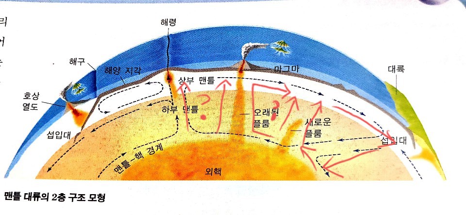 제가 가진 개념과 일치하지가 않는 그림이었습니다 ㅠㅠ 왼쪽은 상부맨틀과 하부맨틀이 따로 순환하는 그림을 나타낸 것인 것 같고, 오른쪽은 맨틀이 전체 대류를 하는 그림을 나타낸 것 같은데요, 저는 오른쪽에서 오래된 플룸과 새로운 플룸이 상승하는 곳에서 상승하는 대류운동이 일어나야 한다고 생각하였는데, 저 판 내부에서 일어나는 플룸활동은 맨틀 대류와 전혀 연관이 없는 모습을 보여 혼란스럽습니다 ㅠㅠ