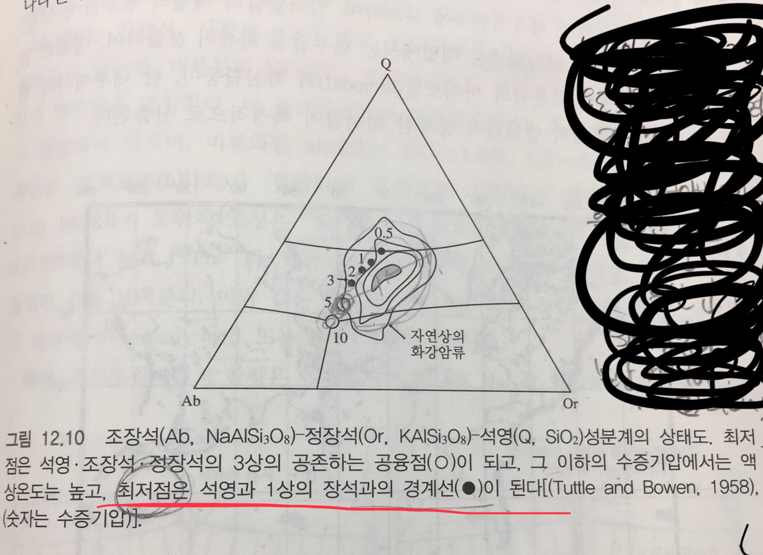 [지질]산성암의 산출 작성자훌라우프|작성시간19.09.06|조회수474 목록 댓글 1 글자크기 작게가 글자크기 크게가 쌤들 암개론 185쪽의 산성암의 성인파트에서 저 그림의 밑줄친 맨 마지막 문장 ‘최저점은 석영과 1상의 장석과의 경계선이 된다.’ 이게 무슨 말인가요? ㅠㅠ 저 까만 점들은 3상이 정출되지않고 2상만 정출된다는 걸까요..? 다음검색 현재 게시글 추가 기능 열기 북마크 공유하기 신고 센터로 신고 댓글 댓글 1 댓글쓰기 답글쓰기 댓글 리스트 작성자감독님 | 작성시간 19.09.09 글만 해석하자면 0.5가 표시된 검은점에 걸쳐있는 가로곡선이 석영과 1상의 장석과의 경계선이네요. 해석하자면 수증기압이 0.5 이하인 경우 최저점이 0.5 검은점에 위치한다는듯? 댓글 전체보기