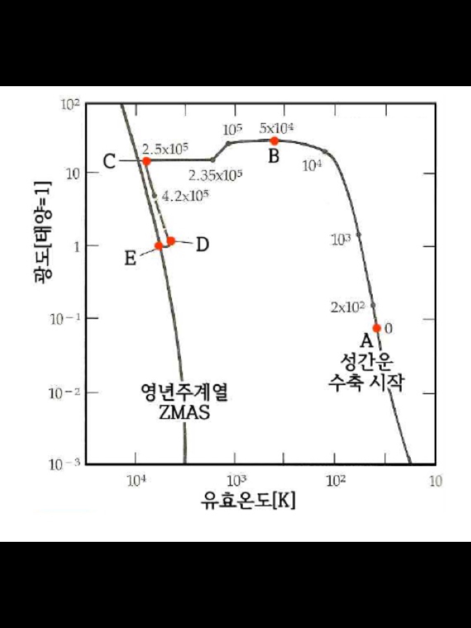 쌤글 여기서 a-b가 원시성의 수축으로 온도와 광도가 높아지고 b-c는 원시성의 외곽부까지 수축하는데 이땐 온도가 크게 증가하지않아서 광도 감소, c-d는 하야시경로;전주계에서 정유체평형 이루며 복사층생겨서 광도감소, d-e는 헤니에이경로 ; 핵반응시작한 주계열성의 광도온도증가.
