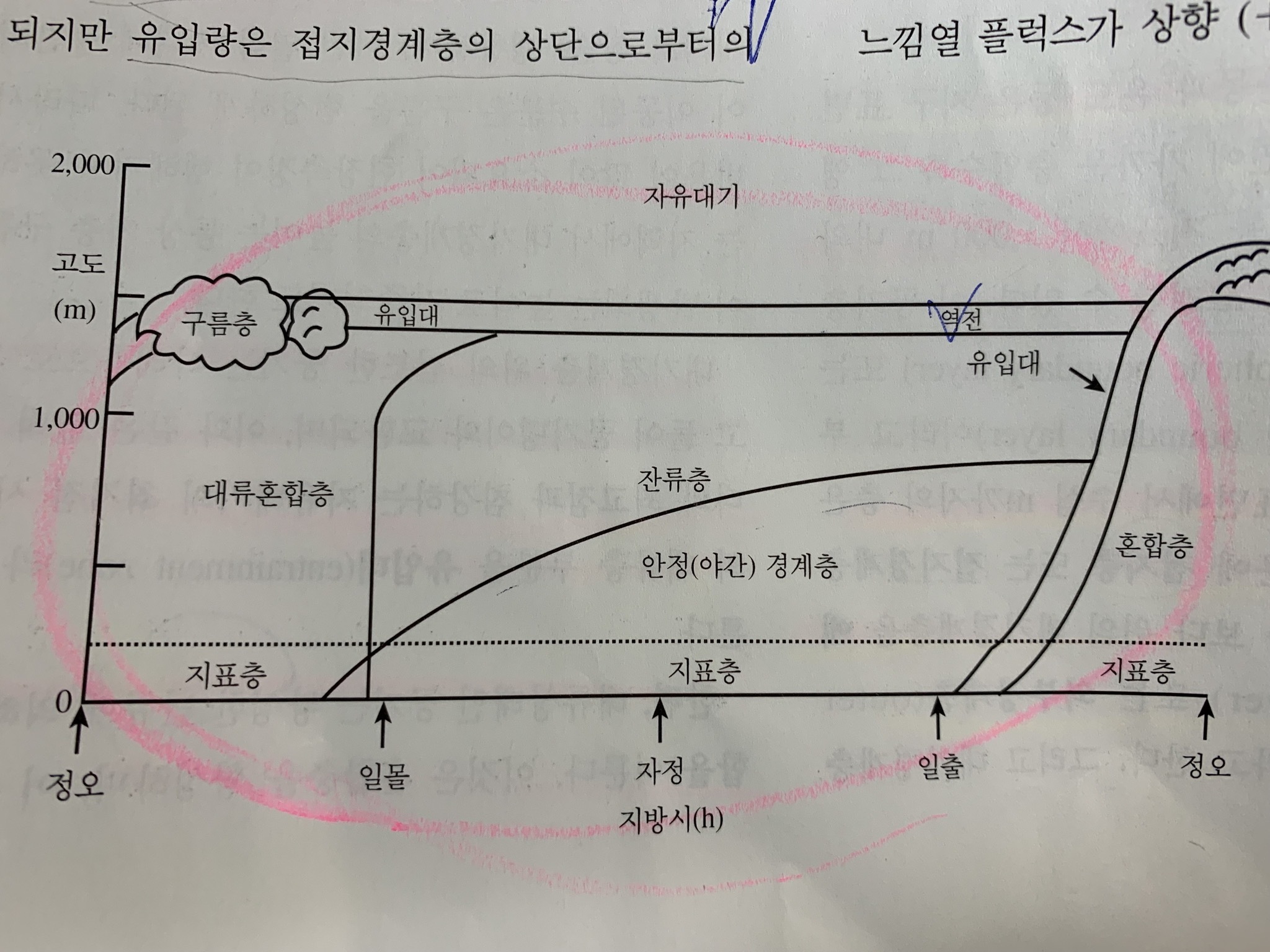 일출 이후에 지면이 달구어지면 지면에 가까운 공기부터 가열됩니다. 이때 얇은 열기포가 발생하여 점점 보다 상공의 공기들과 혼합을 거듭합니다. 이렇게 혼합층의 높이가 점점 높아지며, 혼합층의 상부 경계의 자유대기와 열, 운동량, 수증기 등을 교환하는 유입층의 높이가 점점 높아집니다. -
