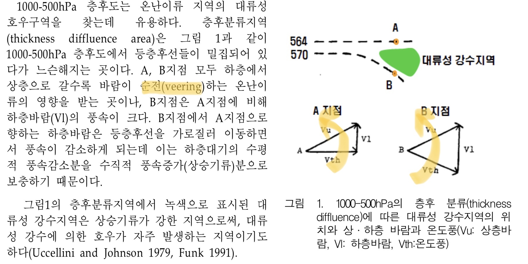 층후분서게 관한 자료 보다가 이해가 안가는 부분이 있어 질문합니다. 글에 보면 A지역 B지역에서 순전하여 온난이류가 온다고 되어 있는데 사진상에 그림은 반전 아닌가요?? 온도풍이 층두께가 두꺼운 지역에서 얇은 지역으로 불기에 온난 이류가 오는게 맞는 것 같은데 하층바람과 상층바람의 변화를 보면 반전이라서 이해가 잘 안가네요...온난이류가 온다고 상층으로 갈수록 바람이 무조건 순전은 아닌건가요??