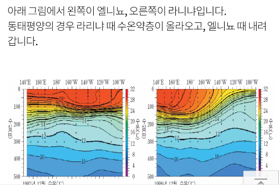무역풍이 약화된 엘니뇨시기에는, 동태평양에서 서쪽으로 따뜻한 해수가 흐르지못해 동태평양부근에서 용승이약해져서 수온약층의 깊이가 깊어진다고하잖아요?