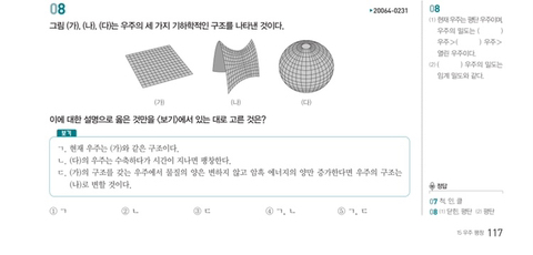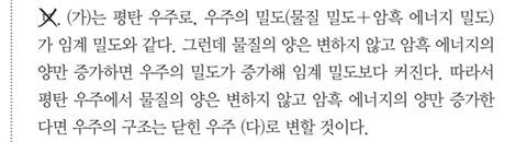 2. 우주의 임계 밀도가 (물질 밀도 + 암흑 에너지 밀도) 라는 내용은 어디에 나오나요? 만약 답지 처럼 우주의 밀도가 커저 닫힌 우주가 되는 거라면 중력의 작용이 우세해야 하는 건데 이해가 가지 않습니다...ㅠㅠ 도와주세요 쌤들....