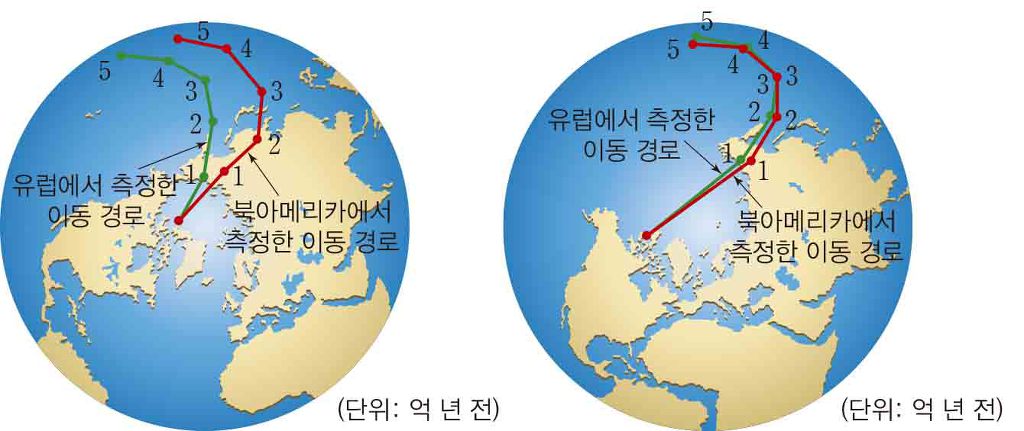 판게아가 존재하던 시기를 맞춘 것이므로, 1,2,4,5억년 전 지자기 북극은 불일치 하는 건가요?