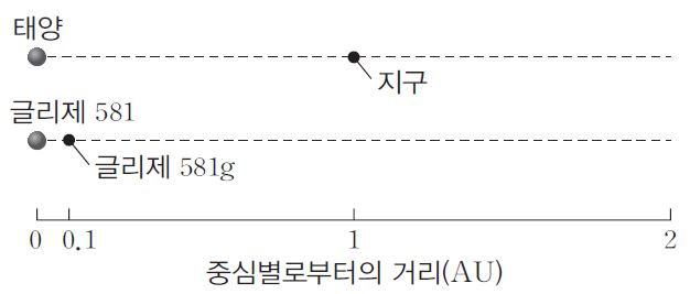 중심별 글리제 581의 생명가능지대에 글리제 581g가 위치하고 있고 글리제581g까지의 거리는 0.1AU