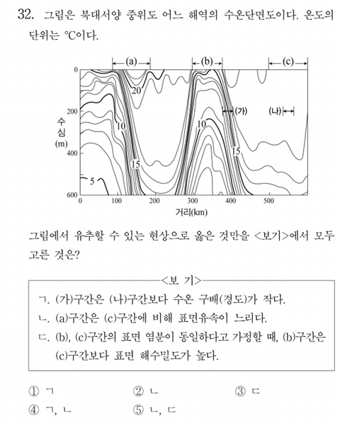 보기 (ㄴ)에서 a구간이 더 빠르다는데 저는 (c)구간의 혼합층이 두꺼운 걸 보고 풍속이 세다 생각해서 ‘표면’유속이니 (c)가 풍속에 의해 더 빠르다고 생각했습니다. 표면유속도 수압경도력의 영향이 더 강한가요??