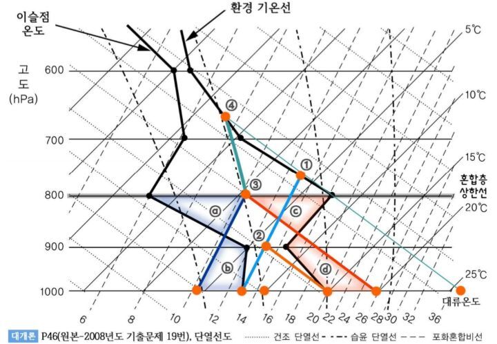위 그림에서처럼 대류응결고도(1)는 지상의 이슬점온도에서 포화혼합비선을 따라갔을 때 환경기온선과 만나는 고도로 구하고, 대류온도는 대류응결고도에서 건조단열선을 따라 지상까지 내려갔을때의 온도로 정의하잖아요.