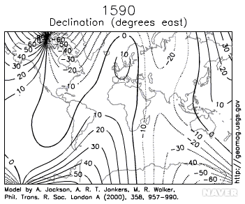마치 지구 안에 막대자석이 있는것 처럼 (쌍극자 모델) 묘사하는게 편하다보니 자북이랑 자북극을 가르키는 방향이 같다는 오개념을 갖게 되는데 만약에 그렇다면 편각 지도가 저렇게 나타나지 않고 마치 경도선처럼 딱 자북극과 자남극을 연결하고 있겠죠!