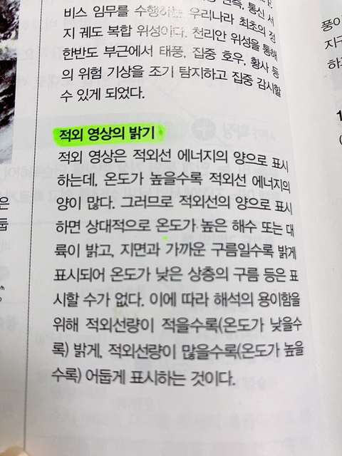 답댓글 작성자감독님 작성시간 21.05.13 22년 합격해보쟈 온도가 높은 해수와 지면과 가까운 구름이 둘다 밝게 표시되어 구분할 수 없다고 했는데, 현재 쓰는 적외영상도 온도가 높은 해수와 지면과 가까운 구름이 둘다 어둡게 표시되는건 마찬가지거든요...