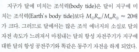달에서는 조석 에너지 소실로 인해 자전 속도가 느려져서 동주기 자전이 되었다고 하는데요