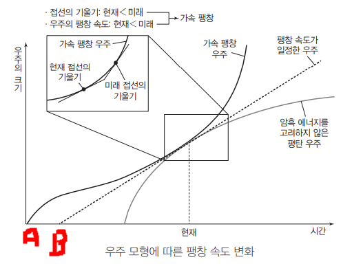 그래프를 보면 <암흑 에너지를 고려하지 않은 평탄 우주>라고 적혀있는데요