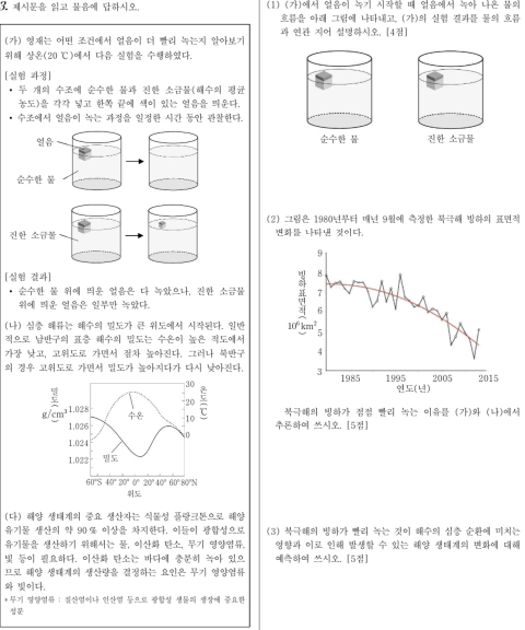 1번은 밀도가 '얼음<순수한 물<얼음녹은물(저온의 순수한 물)<소금물' 이라서 소금물에서는 얼음녹은물이 잘 가라앉지 않아 표층 수온이 낮아지는 것으로 해석했습니다.