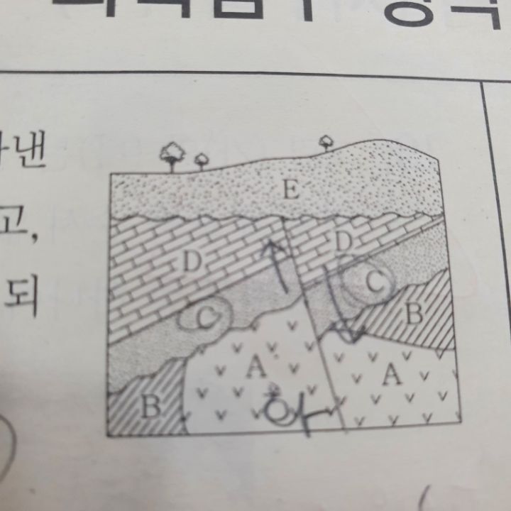 작성자지형류 작성시간 22.08.15 1. 문제 출처를 알 수 있을까요~? 그림을 그대로 보면 상반이 아래로 내려가 정단층인 것처럼 보이지만, 단층면을 포함하는 지층들이 기울어져있습니다. 이 지층들을 수평하게 돌려서 보면 그림에서 오른쪽을 향해 기울어진 게 아니라 왼쪽을 향해 기울어져있는 걸 알 수 있어요. C층을 기준으로 보면 상반이 위로 올라가서 역단층이 됩니다.