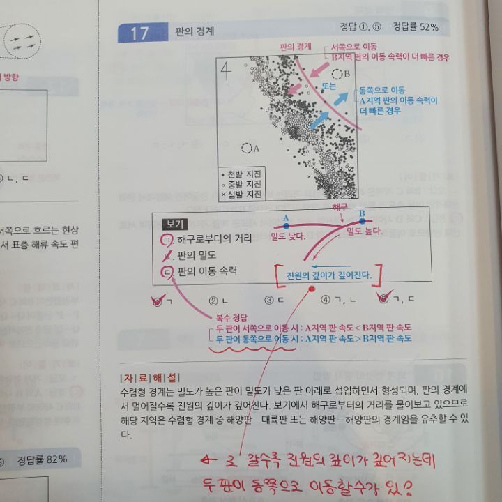 2. B판이 A판 아래로 섭입하면서 서쪽으로 갈수록 진원 깊이가 깊어지는 게 맞는데요, A판의 이동 속도가 빠를 경우에는 두 판이 동쪽으로 밀릴 수 있어요. 해구도 어느정도 깊어지면 섭입 속도가 느려지기 때문에, A판 위에 해령이 있고 빠르게 발산한다면 충분히 가능하죠 -