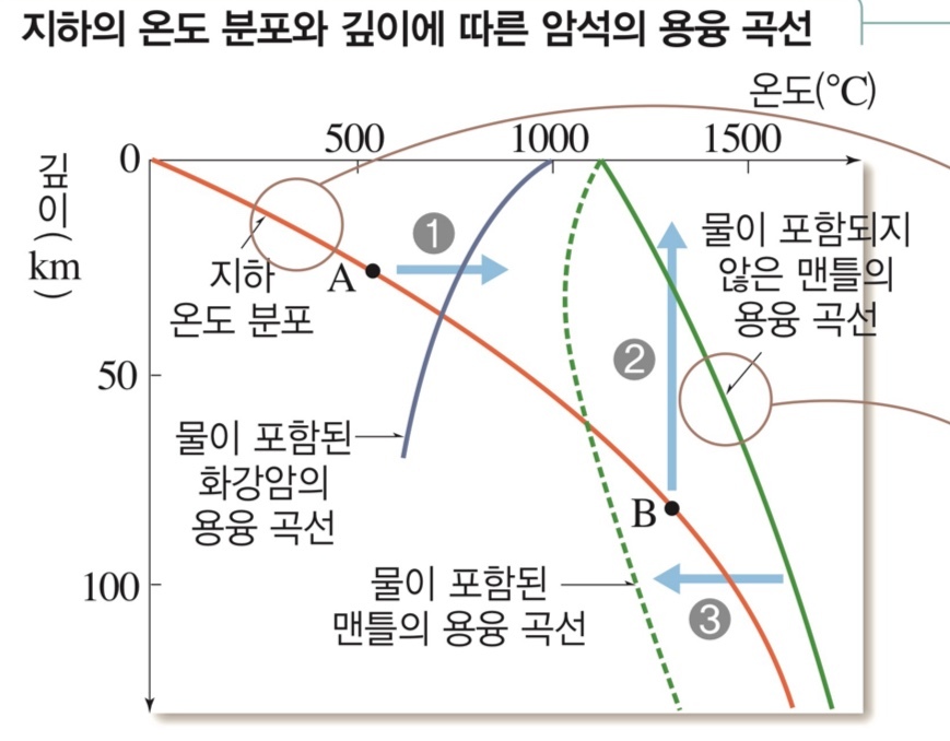 작성자olivine 작성시간 22.09.06 1. 압력이 작용하기 때문이라고 생각됩니다. 특정한 압력에서 어떤 물질의 용융점이 결정되는데 암석은 순물질이 아니라 압력이 용융점과 단순히 비례관계에 있는 게 아니라서 그런 것 같네요. 이 부분은 저도 자세히 생각해본적이 없어서 ㅎㅎ