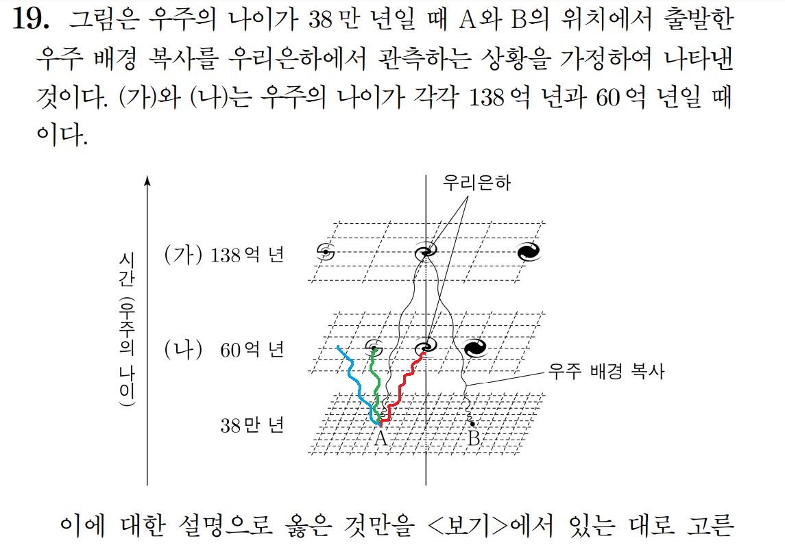 작성자SNbega 작성시간 22.09.21 빨색선: A에서 발생한 배경복사는 현재시점에 우리은하에 도달하기 때문에 옳지 않음. A보다 가까운 지점에서 발생한 cmb 가 60억년전에 우리은하에 도달해야함